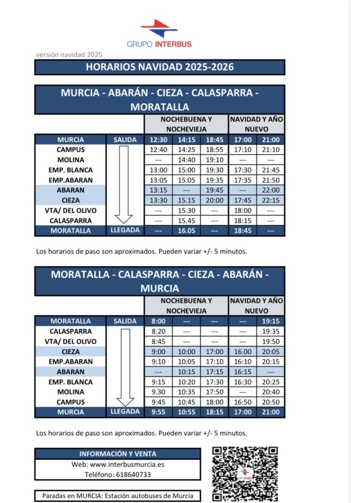 El Grupo Interbus, concesionario de la línea de autobuses de viajeros Abarán–Murcia, ha dado a conocer los nuevos horarios que estarán en vigor durante el periodo de las fiestas navideñas.