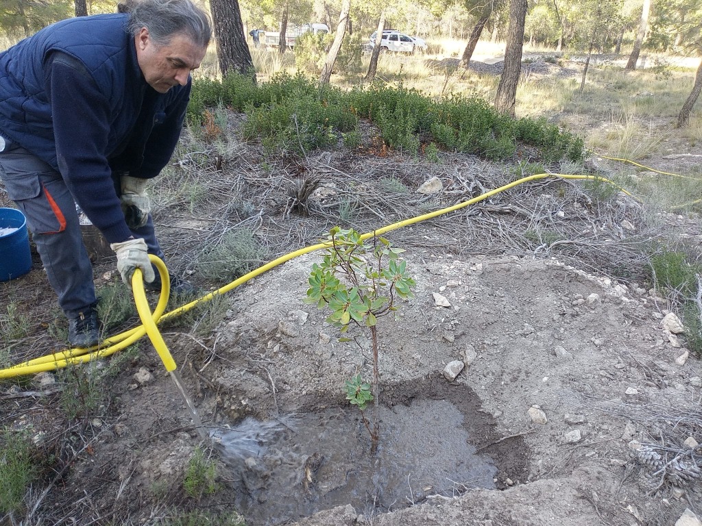Para poder garantizar el arraigo de los plantones, se han efectuado riegos, transportando agua a la zona mediante depósitos de 1000 litros, e instalando protectores individuales para evitar los daños que pueda ocasionar la fauna, especialmente los producidos por jabalíes.