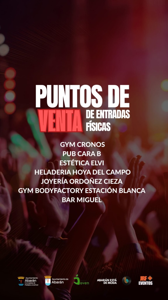 Las entradas físicas pueden adquirirse en los siguientes puntos de venta: Gym Cronos, Pub Cara B, Estética Elvi, Heladería Hoya del Campo, Joyería Ordóñez (Cieza), Gym BodyFactory (Estación de Blanca) y Bar Miguel.