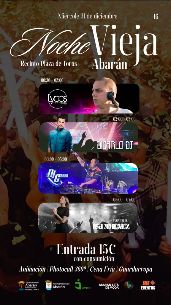 La Concejalía de Festejos del Ayuntamiento de Abarán ha dado a conocer la programación especial de las fiestas de Nochebuena y Nochevieja 2025, que se celebrarán nuevamente en la carpa instalada en la Plaza de Toros. Se trata de una propuesta consolidada que busca ofrecer una alternativa de ocio segura y atractiva durante la Navidad, especialmente pensada para que los jóvenes del municipio puedan disfrutar sin necesidad de desplazarse fuera de la localidad.