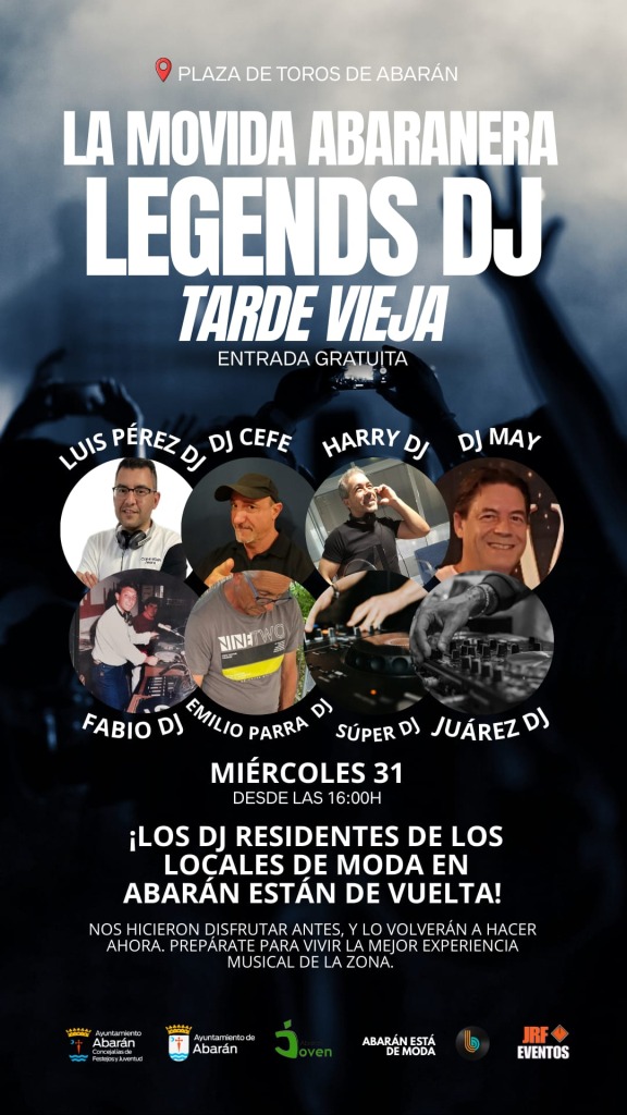 El 31 a partir de las 16:00 horas se celebra “La Movida Abaranera Legends DJ – Tarde Vieja”, un evento que reunirá a algunos de los DJ más emblemáticos de la localidad, con entrada gratuita.