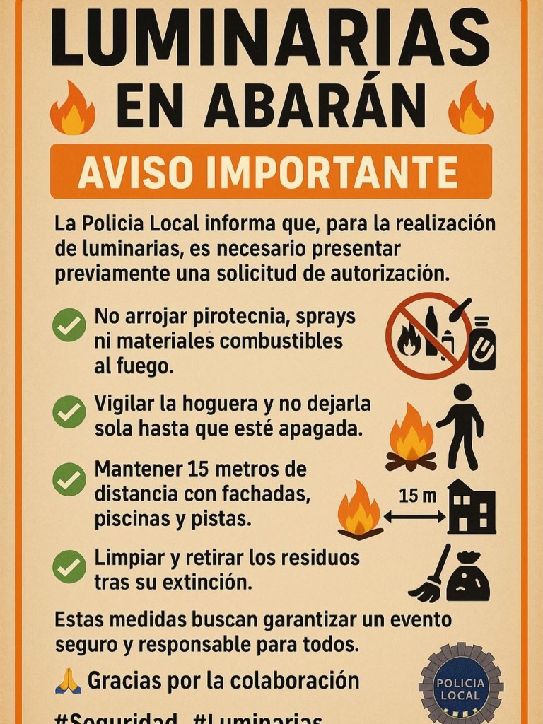 La Policía Local de Abarán ha emitido un aviso dirigido a la ciudadanía con motivo de la próxima celebración de luminarias en el municipio. El cuerpo de seguridad informa de que toda hoguera deberá contar previamente con una autorización oficial, que se concederá únicamente cuando el lugar propuesto cumpla la normativa vigente.