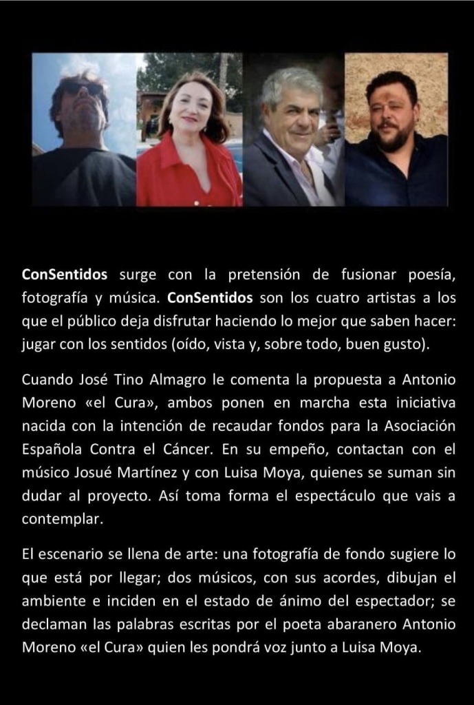 “ConSentidos” es un proyecto artístico que invita a disfrutar a través de los sentidos —oído, vista y, sobre todo, buen gusto— y que nace del impulso creativo de los abaraneros José Tino Almagro y Antonio Moreno “el Cura”, quienes pusieron en marcha esta iniciativa cultural con un marcado carácter benéfico, para recaudar fondos destinados a la AECC. A ellos se suman el también músico de Abarán, Josué Martínez y la artista Luisa Moya, completando un elenco de cuatro intérpretes que harán vibrar al público con un espectáculo lleno de sensibilidad y arte.