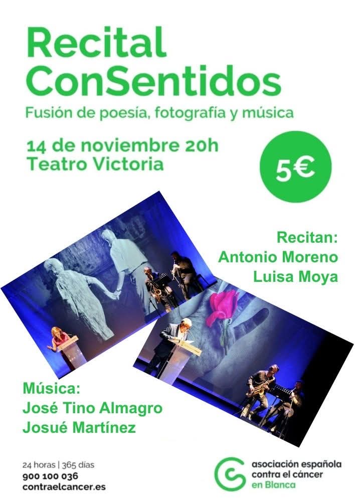 El próximo viernes 14 de noviembre, a las 20:00 horas, el Teatro Victoria de Blanca acogerá el recital “ConSentidos”, una original propuesta que fusiona poesía, fotografía y música con un fin solidario: recaudar fondos para la Asociación Española Contra el Cáncer.