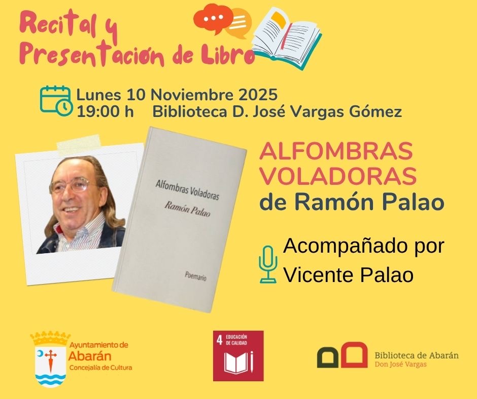La Biblioteca Municipal D. José Vargas Gómez acogerá el próximo lunes, 10 de noviembre, a las 19:00 horas, un nuevo encuentro literario con motivo de la presentación del libro “Alfombras Voladoras”, obra del escritor yeclano Ramón Palao.