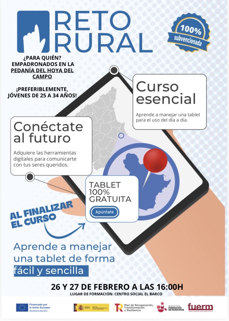 La pedanía de Hoya del Campo será escenario nuevamente los días 26 y 27 de febrero (jueves y viernes), a partir de las 16:00 horas, de una acción formativa gratuita dirigida a fomentar las competencias digitales de la población joven. La actividad se desarrollará en el Centro Social El Barco y forma parte del programa Reto Rural Digital.